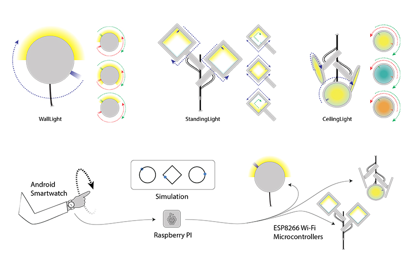A central hub (Raspberry PI) runs a simulation of all moving targets of all connected lights - ensuring these targets do not correlate amongst themselves. It continuously sends instructions to each light's embedded microcontroller wirelessly. A smart watch sends movement data to the hub, which then correlates these movements and acts upon 'selection'. In addition to selection, twisting the wrist while a light was selected would affect the light's overall brightness.